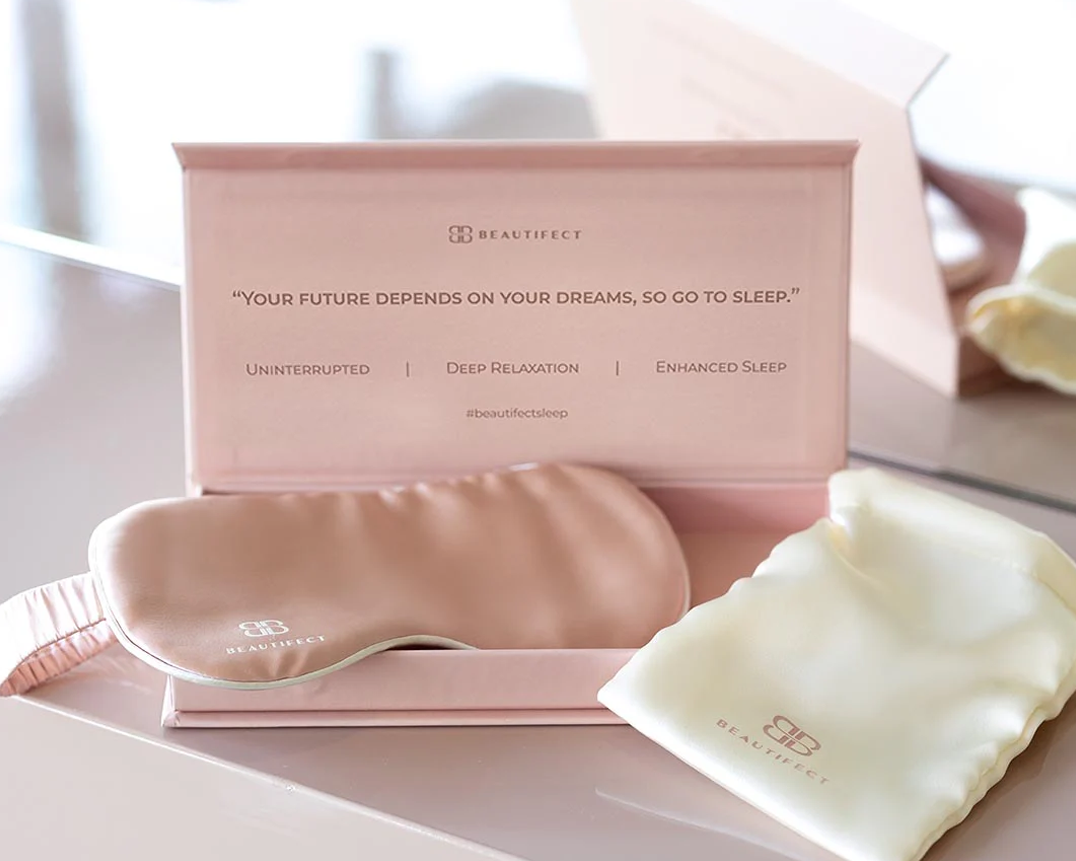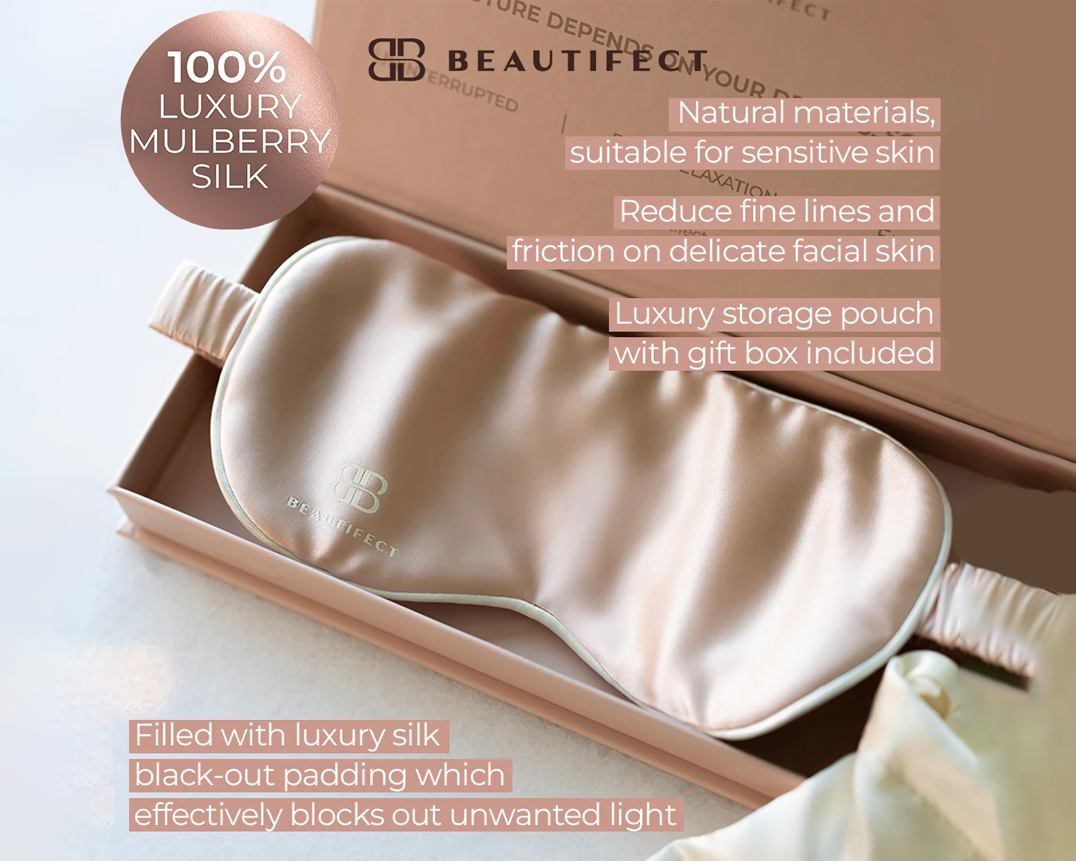 Nothing says luxury like Silk, especially pure 100% Mulberry Silk. With a comfortable cushioned design to sit softly against your face. The Beautifect Silk Eye Mask gently protects delicate skin and is specially filled with luxury silk black-out padding which effectively blocks out unwanted light for the ultimate undisturbed beauty slumber.