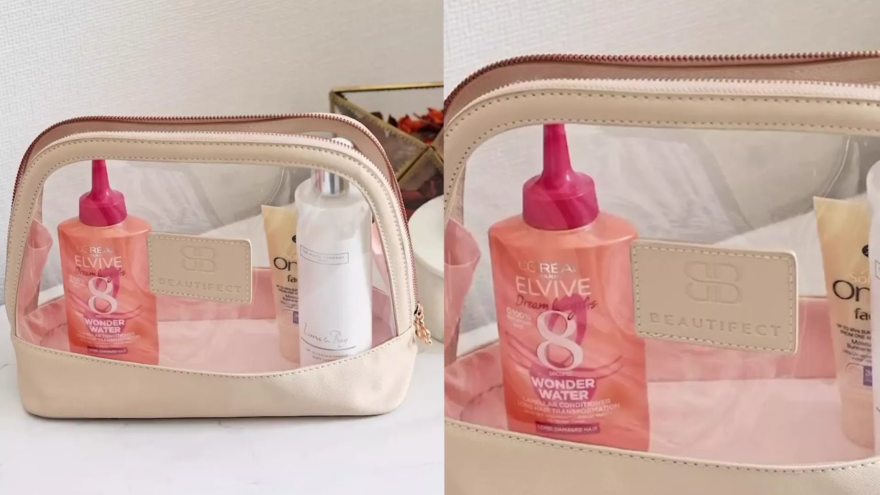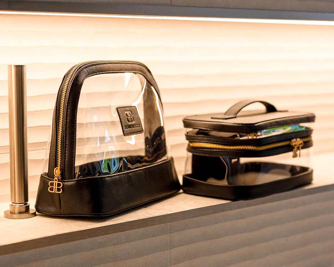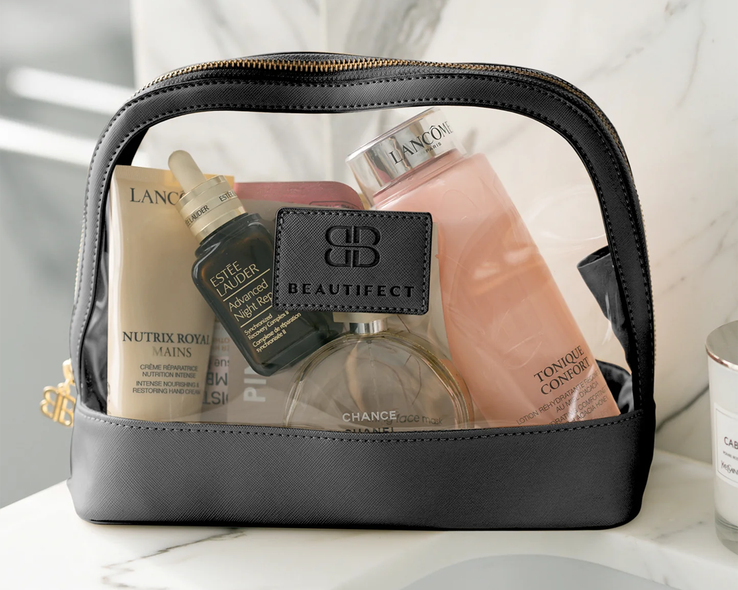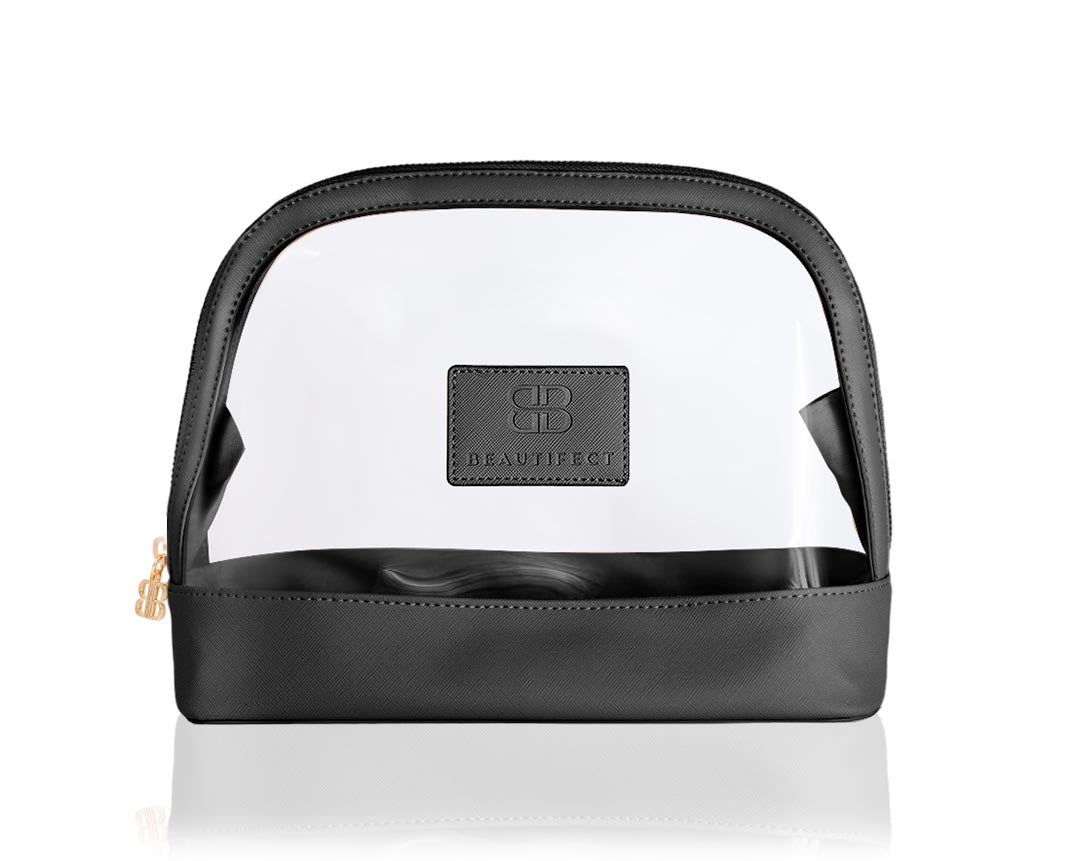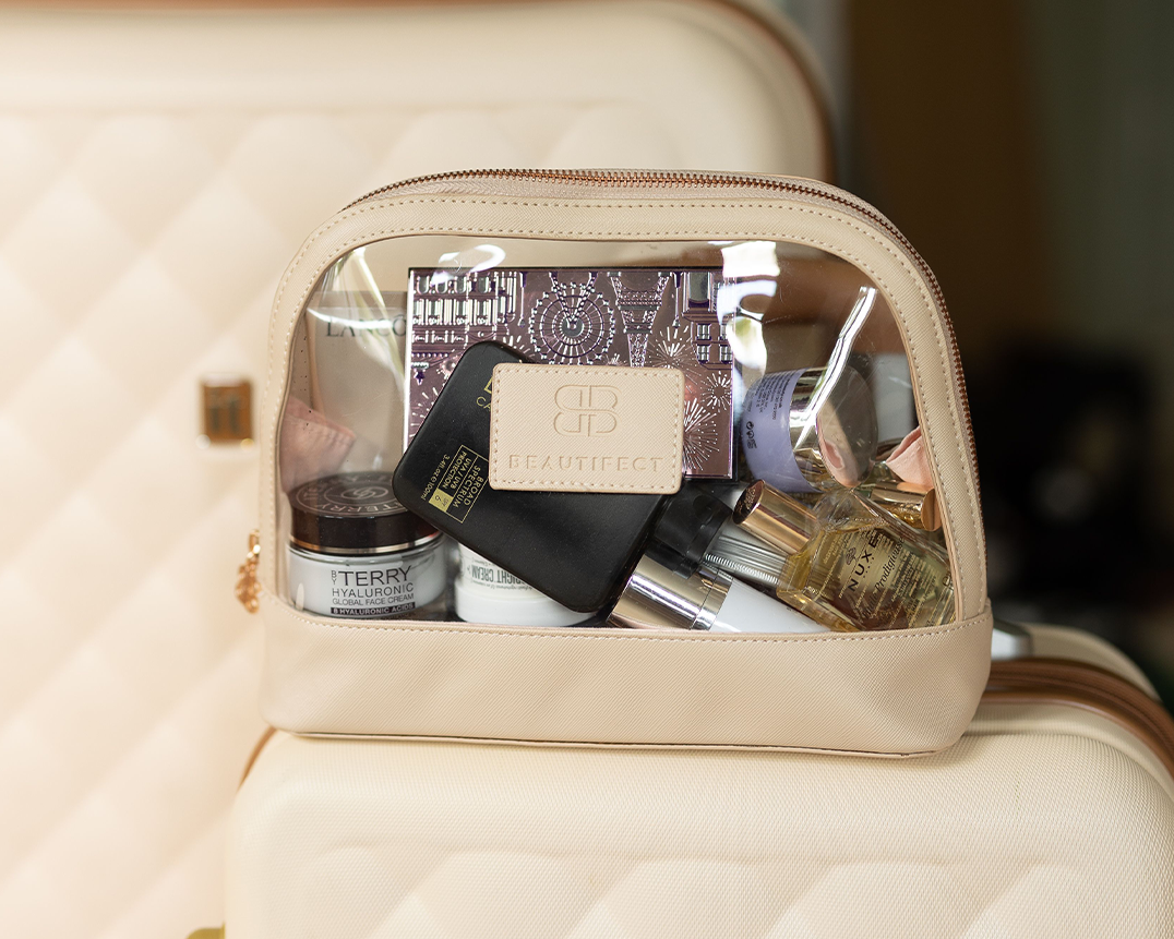 A chic clutch like pouch design that’s beautifully finished with vegan leather, suede and signature Beautifect zip details. The Toiletry Bag is complete with a wipeable clear exterior to help you instantly find what you're looking for and a large sturdy but flexible zipped compartment to keep your products safe, secure and easy to find. Perfect for all your travel and day to day needs; the ingenious space saving design means you can effortlessly stow into any space to maximise your packing requirements. The transparent panels are perfect for carry-on luggage too!