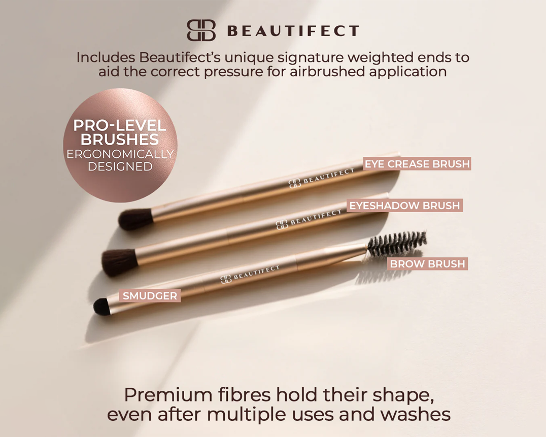 Crafted with a luxe matte gold finish; each brush is densely filled with soft premium quality vegan bristles to seamlessly apply and blend all formulas. The length has been ergonomically designed to fit neatly into your hand and includes our unique signature weighted ends to aid the correct pressure for airbrushed application. Premium fibres hold their shape, even after multiple uses and washes.