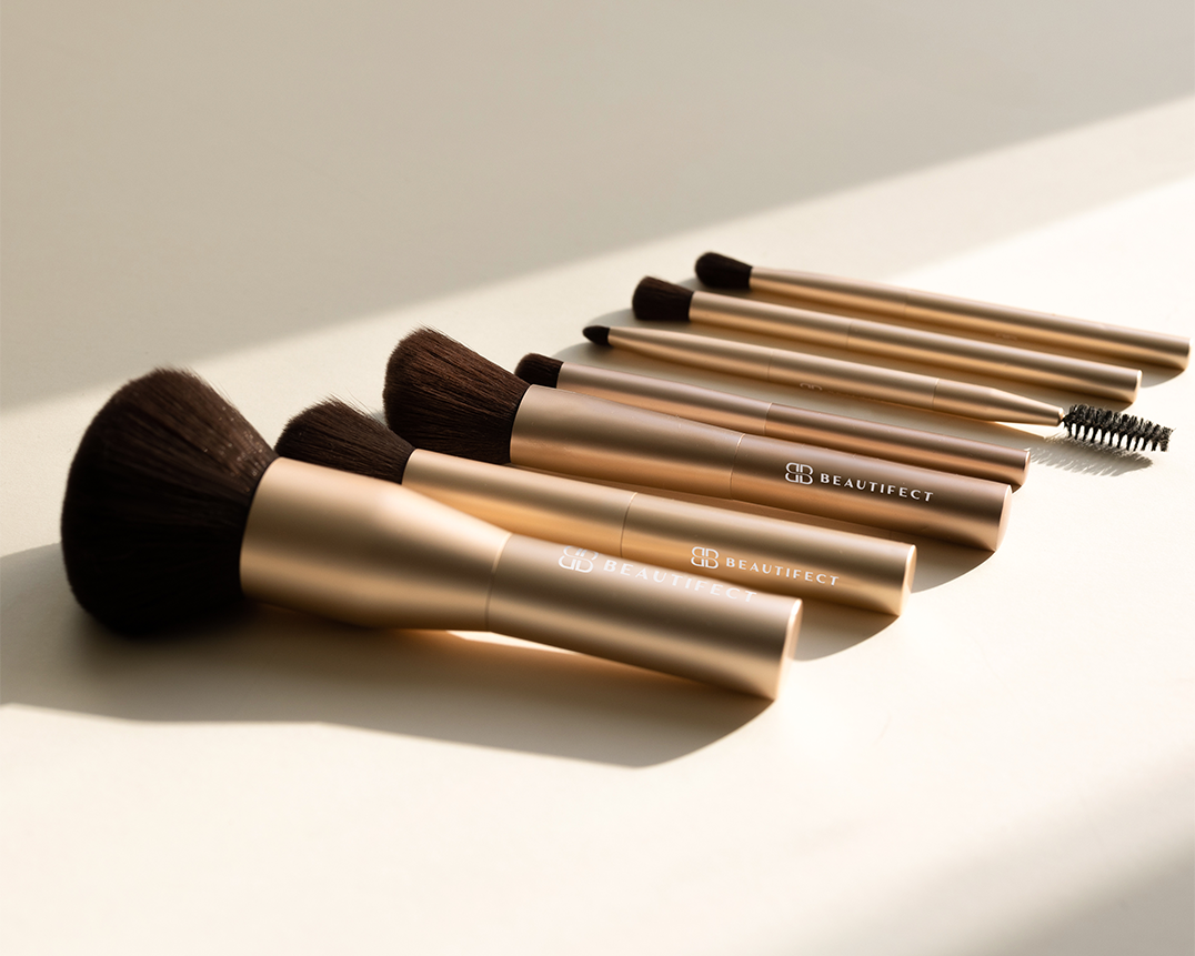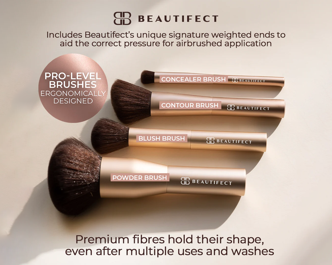 Crafted with a luxe matte gold finish; each brush is densely filled with soft premium quality vegan bristles to seamlessly apply and blend all formulas. The length has been ergonomically designed to fit neatly into your hand and includes our unique signature weighted ends to aid the correct pressure for airbrushed application. Premium fibers hold their shape, even after multiple uses and washes.